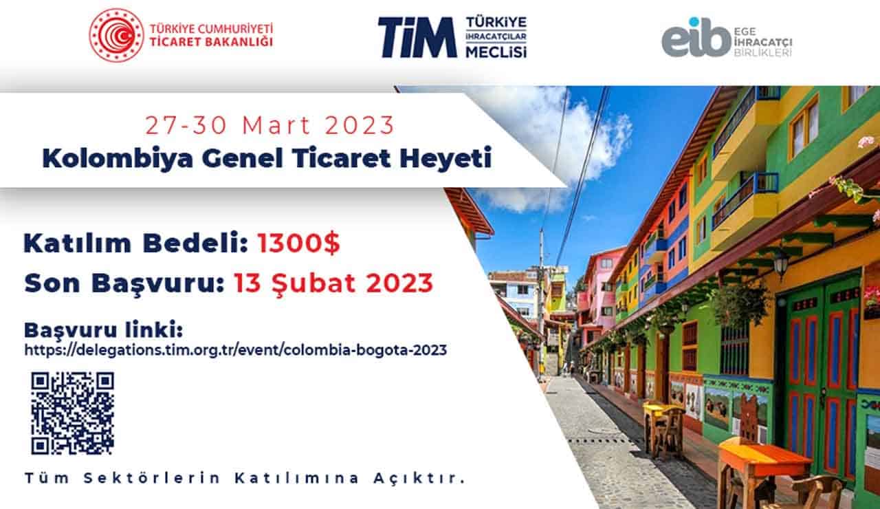 Ege İhracatçı Birlikleri, Ticaret Bakanlığı Koordinasyonunda, Türkiye İhracatçılar Meclisi’yle iş birliğinde, tüm sektörleri kapsayan genel nitelikli Ticaret Heyeti organizasyonuyla Türkiye’den Kolombiya’ya ihracatı kısa vadede 750 milyon dolara çıkarmayı hedefliyor.